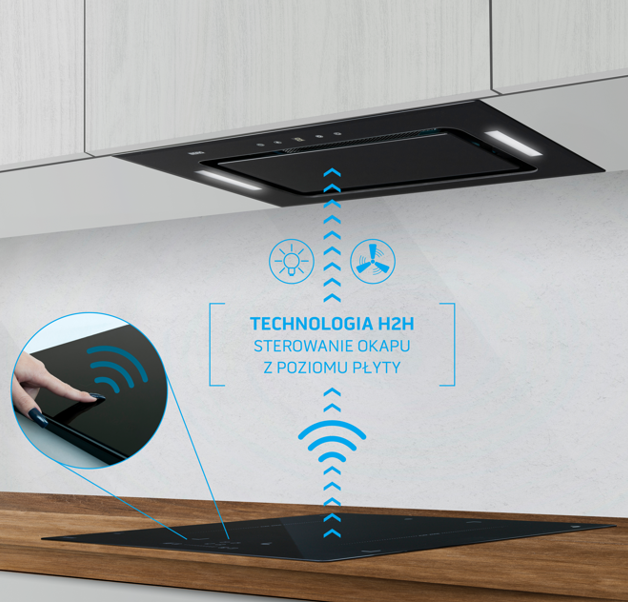 Funkcja H2H (Hood to Hob) tworzy inteligentny duet Twojej płyty indukcyjnej z okapem, pozwalając na wygodne sterowanie mocą wentylacji i oświetlenia okapu wprost z panelu sterowania płyty, bez konieczności sięgania po pilota.