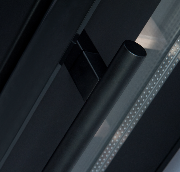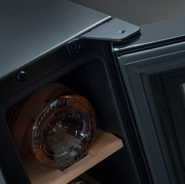 Szklane drzwi w kolorze czarnym dodają winiarce elegancji, a jednocześnie umożliwiają podziwianie zawartości. Wysokość szklanego frontu wynosi 71,4 cm, co sprawia, że winiarka świetnie komponuje się w zabudowie kuchennej.