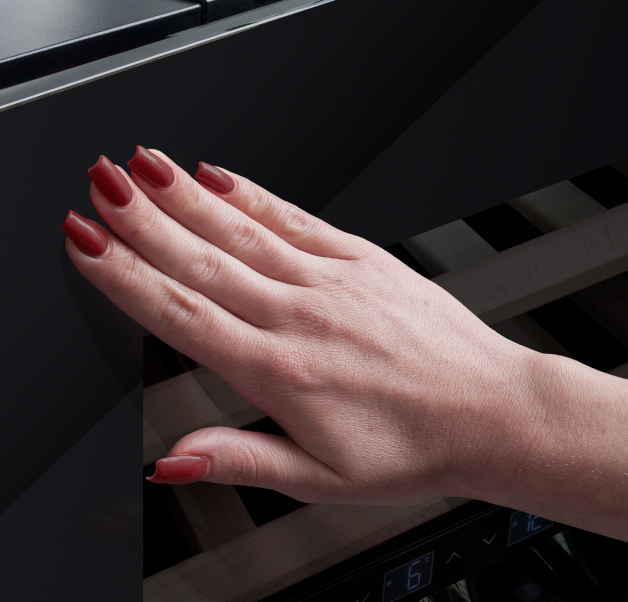Konstrukcja winiarki sprawia, że front jest gładki i minimalistyczny, co doskonale wpisuje się w nowoczesne wnętrza. Ponadto, brak tradycyjnych uchwytów oznacza mniej elementów wystających, co ułatwia czyszczenie i utrzymanie w czystości. Funkcja „push to open” zapewnia wygodne i szybkie otwieranie drzwi – wystarczy lekki nacisk, aby je otworzyć lub zamknąć, co jest szczególnie praktyczne w codziennym użytkowaniu. Taki system zwiększa także komfort korzystania, eliminując konieczność szukania uchwytów i zapewniając elegancki, spójny wygląd urządzenia. Dodatkowo zawiasy K-Hinge zapewniają łatwy i stabilny dostęp do wnętrza winiarki, jednocześnie umożliwiając precyzyjne i trwałe zamknięcie drzwi.