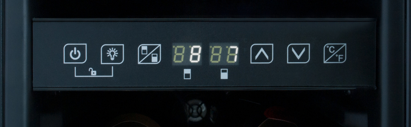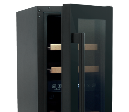 Dwuwarstwowe szklane drzwi z filtrem UV w kolorze czarnym dodają winiarce elegancji, a jednocześnie umożliwiają podziwianie zawartości. Wysokość szklanego frontu sprawia, że winiarka świetnie komponuje się w zabudowie kuchennej.