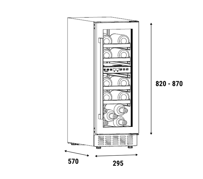 Dzięki szerokości zaledwie 29,5 cm, winiarka oferuje zaskakująco pojemne wnętrze, idealnie wykorzystując każdy centymetr przestrzeni, by pomieścić Twoją kolekcję win bez poświęcania miejsca w kuchni.
