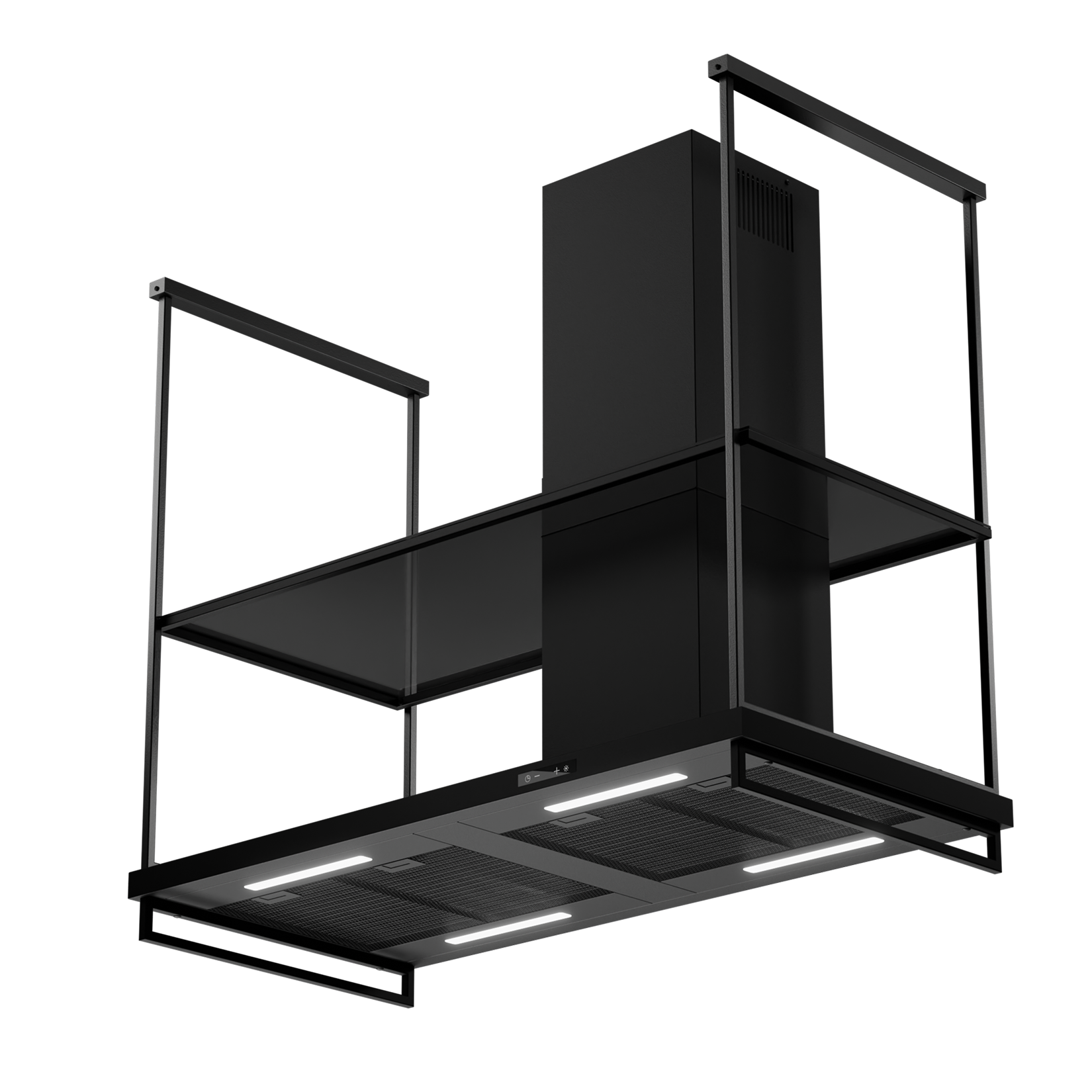 Elegancki i nowoczesny wygląd okapu idealnie komponuje się z każdą kuchnią, a czarny, skośny panel w połączeniu z metalową, czarną półką tworzy spójny, dizajnerski wizerunek. To połączenie nie tylko nadaje urządzeniu wyrafinowanego charakteru, ale także czyni je niezwykle praktycznym – półka stanowi funkcjonalny element do tymczasowego odstawiania przypraw czy akcesoriów kuchennych.