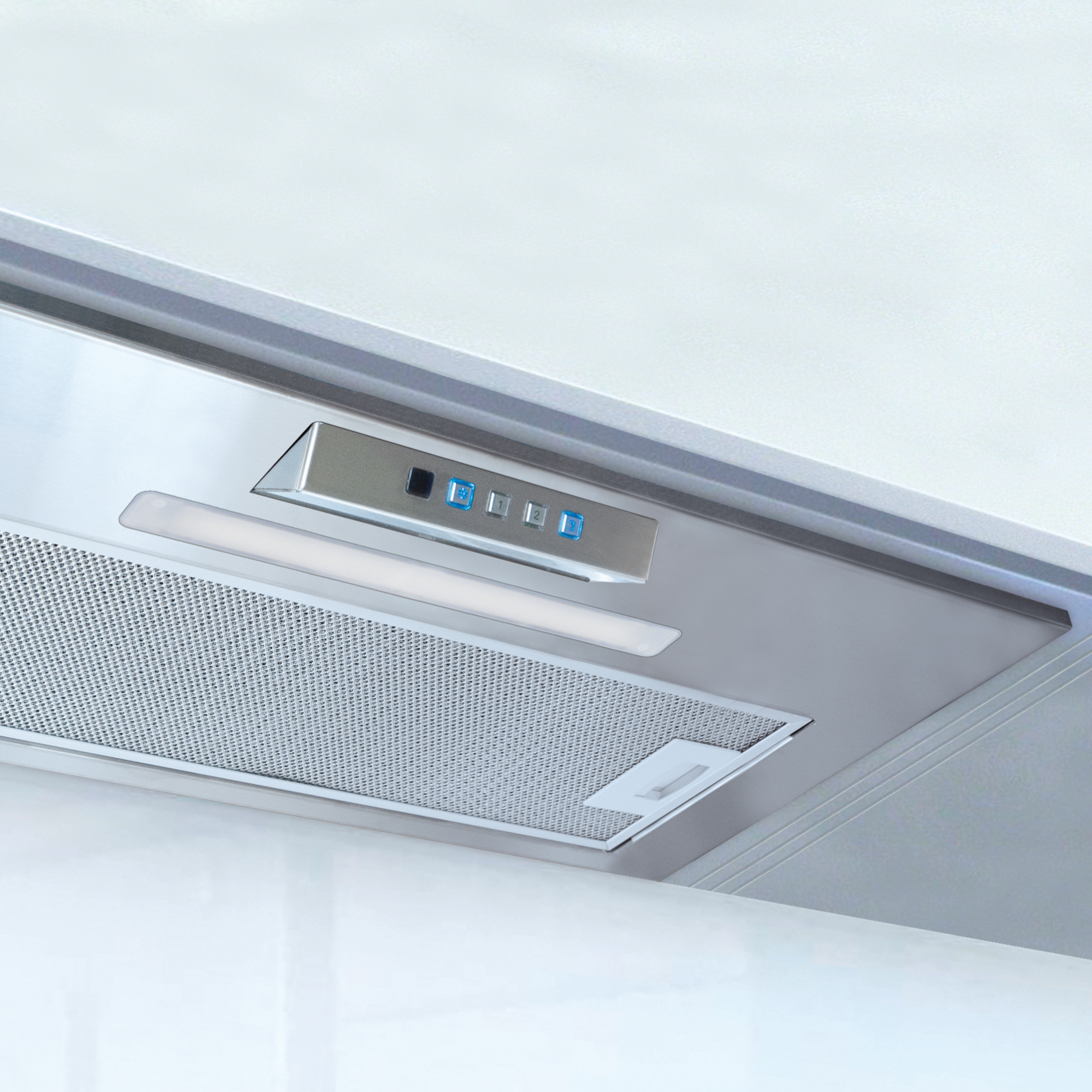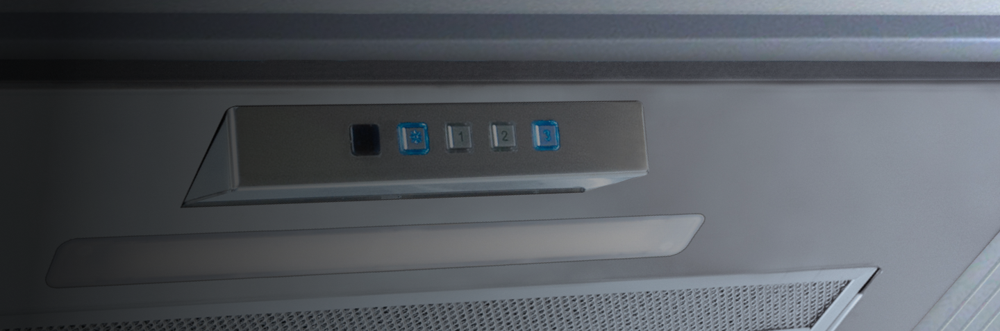 Sterowanie przyciskami w okapie zapewnia intuicyjną obsługę, szybki wybór trybów pracy i łatwe dopasowanie wydajności do potrzeb gotowania.