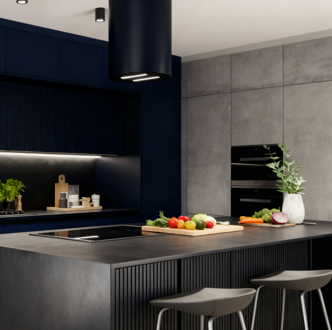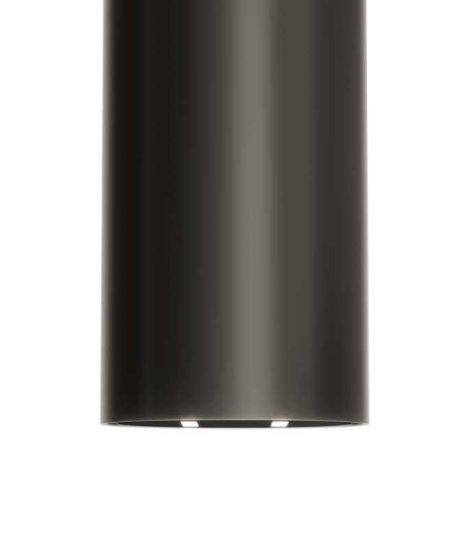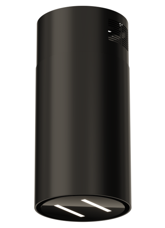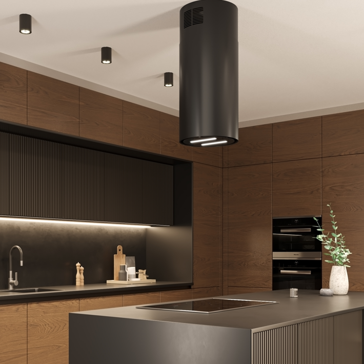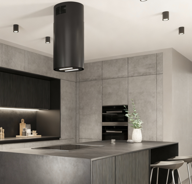 Elegancki i nowoczesny wygląd okapu, zdominowany przez głęboką czerń szklanego frontu i cylindryczny kształt idealnie komponuje się z każdym stylem kuchennym – od minimalistycznych wnętrz po industrialne aranżacje.