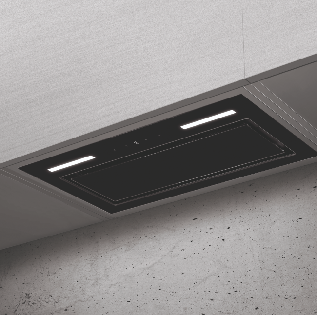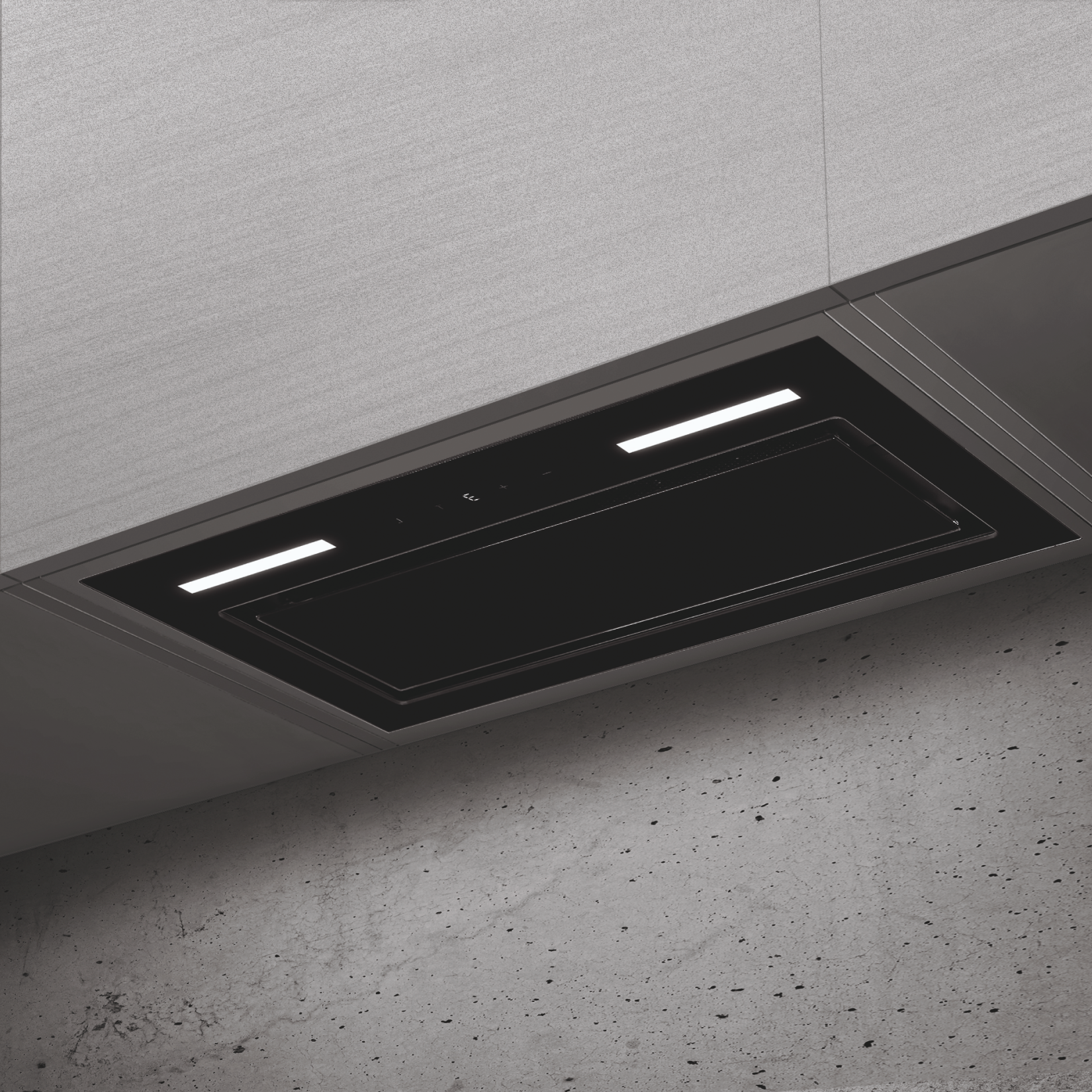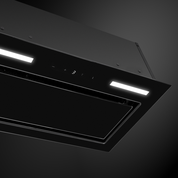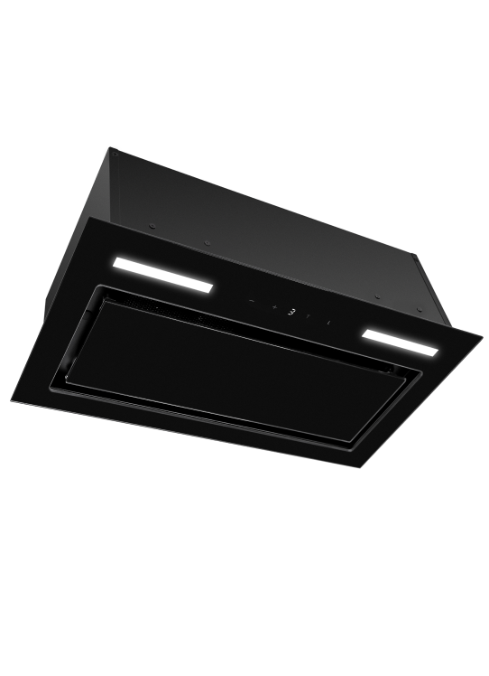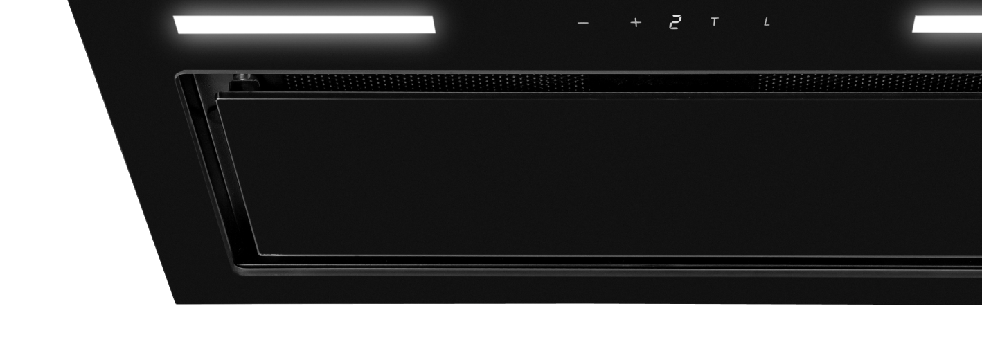 Wykonany z czarnego szkła i metalowego korpusu, okap o szerokości 55 cm idealnie integruje się z szafkami 60 cm, tworząc spójną, nowoczesną linię zabudowy. To połączenie zaawansowanej technologii i minimalistycznego designu, które redefiniuje standardy kuchennej wentylacji.