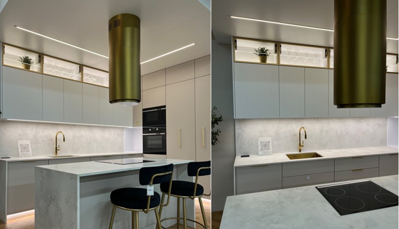 Okap wyspowy FLOYD w eleganckim odcieniu złota to połączenie luksusowego designu z najnowocześniejszą technologią. Dostępny również w wersji przyściennej, idealnie dopasuje się do każdej aranżacji, stanowiąc jej unikatowy akcent.
